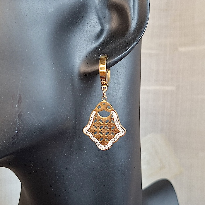 Pendientes de aro en acero quirúrgico con acabado dorado y de diseño trenzado. Un centímetro de diámetro. El tipo de cierre es Mariposa.